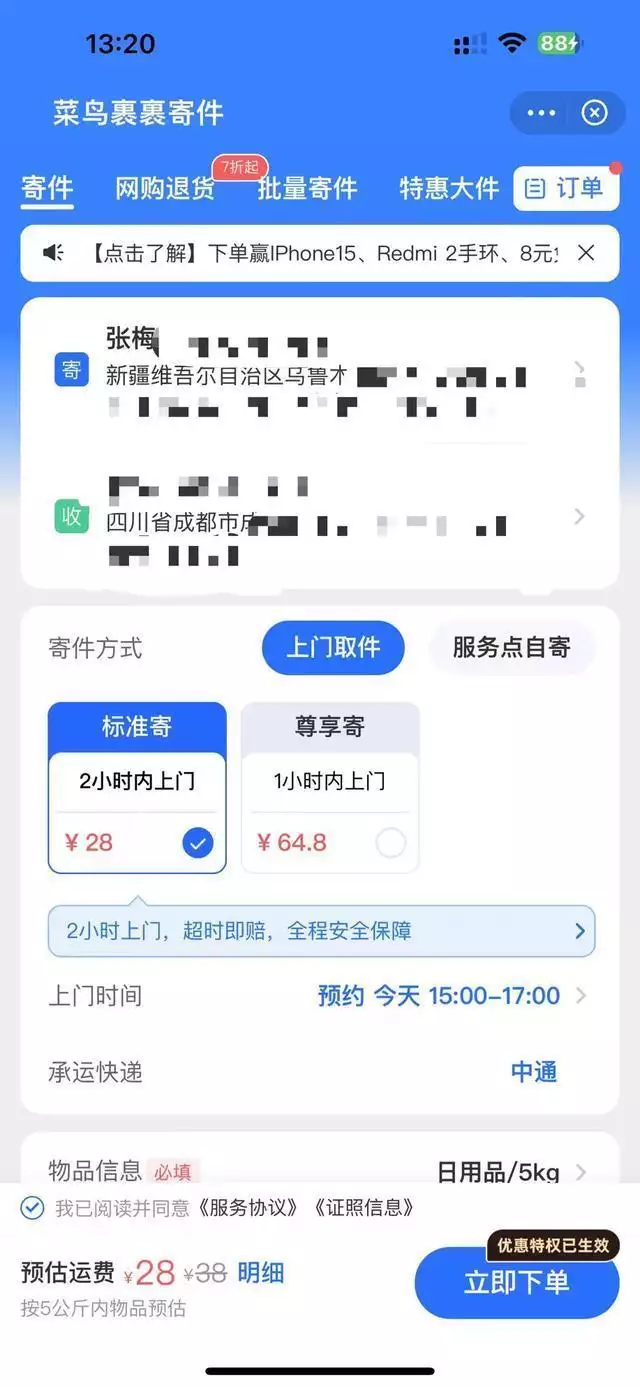 6月14日,张梅抽到了第二张5折寄件券,并在当天寄出5公斤衣物,经五折券后,运费立即省下10元。“新疆到内地的快递运费一直都比较贵,但我发现了菜鸟App的周五寄件日活动,我已经连续两周抽到5折券,每周省下都运费比疯狂星期四还划算。”张梅分享到,通过App下单快递员还能到宿舍楼下取件,非常方便,“离开学校的时候不用大包小包拎着行李,优雅永不过时稳稳拿捏。”